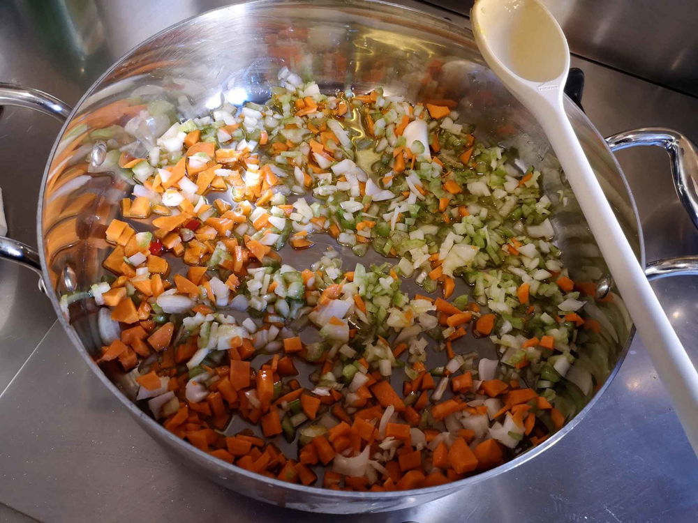 In una padella mettete l'olio ed il trito appena preparato e fate soffriggere.